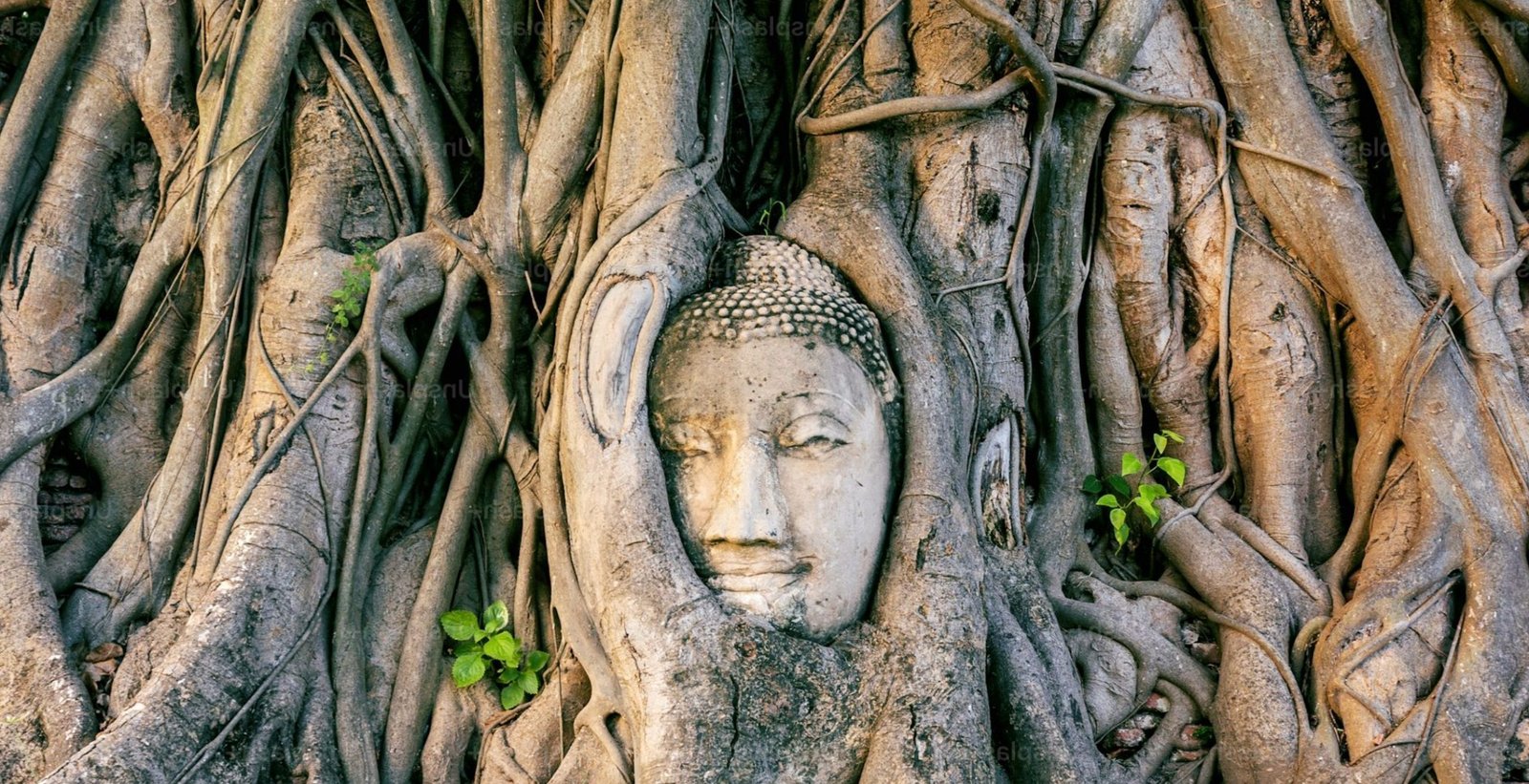 The Buddha head in tree roots is best photographed in soft morning light